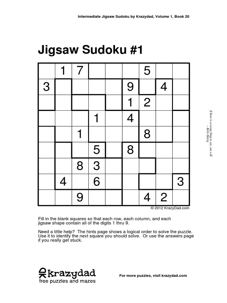 Jigsaw Sudoku Puzzles By Krazydad from krazydad.com Maybe you would like to learn more about one of these? Check spelling or type a new query. We did not find results for: Jigsaw sudoku puzzles by krazydad.